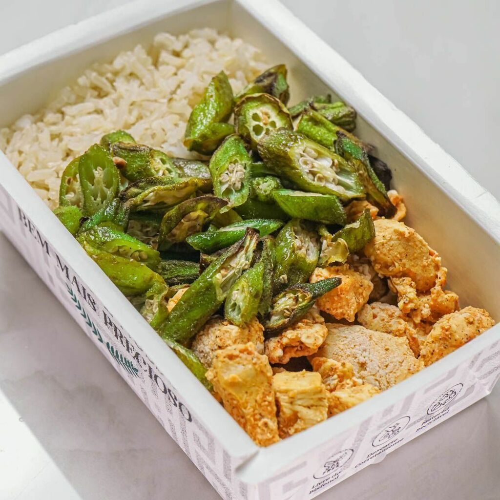 Esse prato traz 100g de frango assado suculento e temperado na medida certa, acompanhado por 100g de arroz integral soltinho e 50g de quiabo assado, preservando textura e sabor.