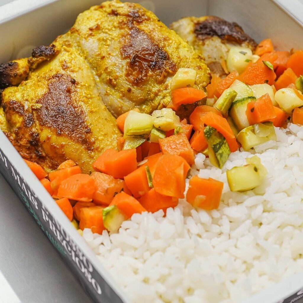 Este prato traz sobrecoxa de frango assada, acompanhada de arroz branco soltinho legumes variados cozidos no ponto ideal. Uma refeição saudável e prática para o seu dia a dia.